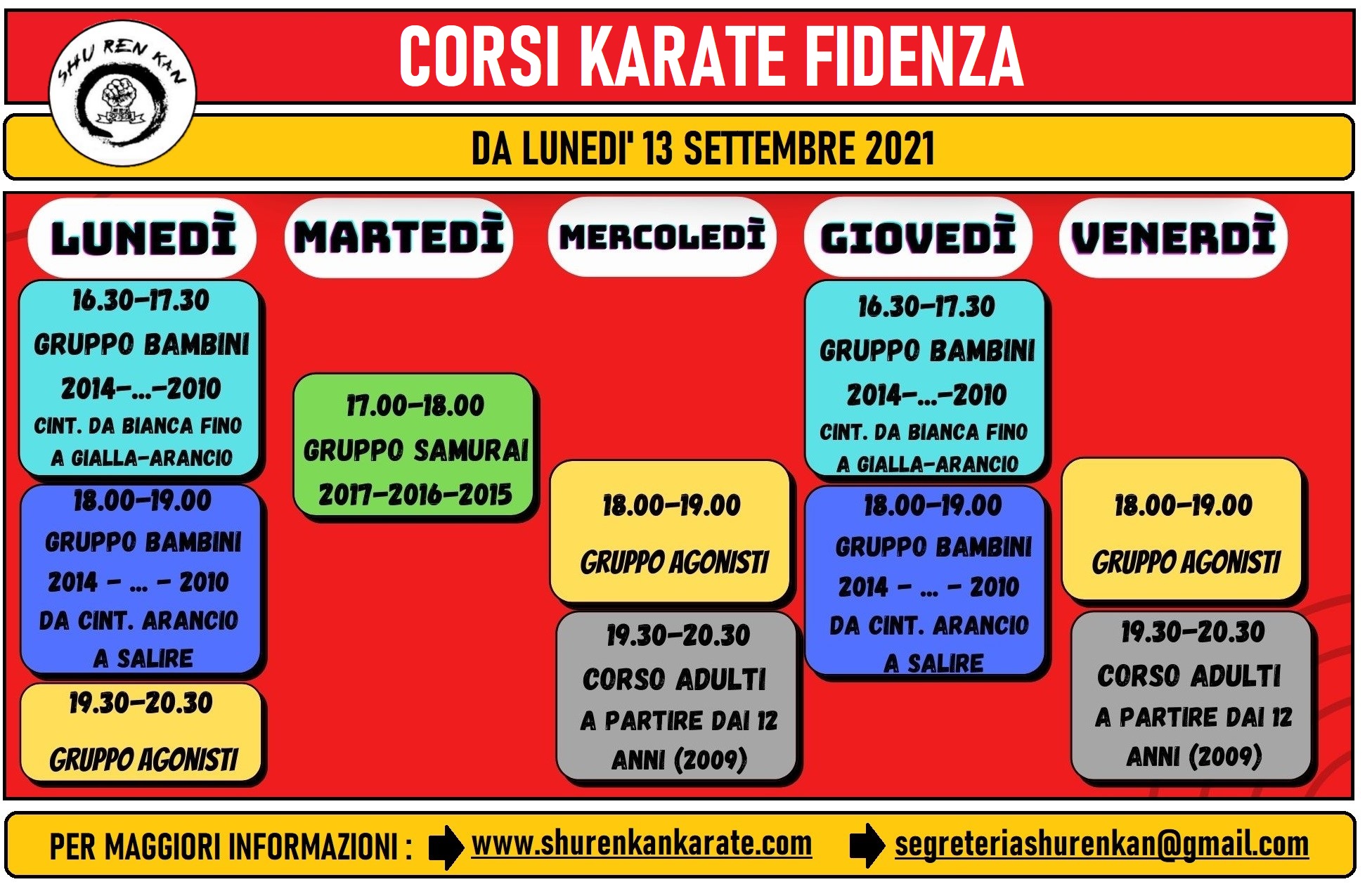 CORSI KARATE SHU REN KAN FIDENZA. TUTTE LE INFORMAZIONI! Posted by Manuel Bazzocchi - 2 Settembre 2021 with 0 Comment Fidenza è pronta a ricominciare! Sottostante troverete il Plan settimanale dei nostri corsi di Karate con le ulteriori specifiche. Per maggiori informazioni o chiarimenti, ti ricordiamo di visitare la nostra pagina INFORMAZIONI.