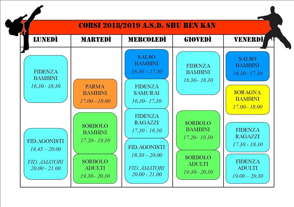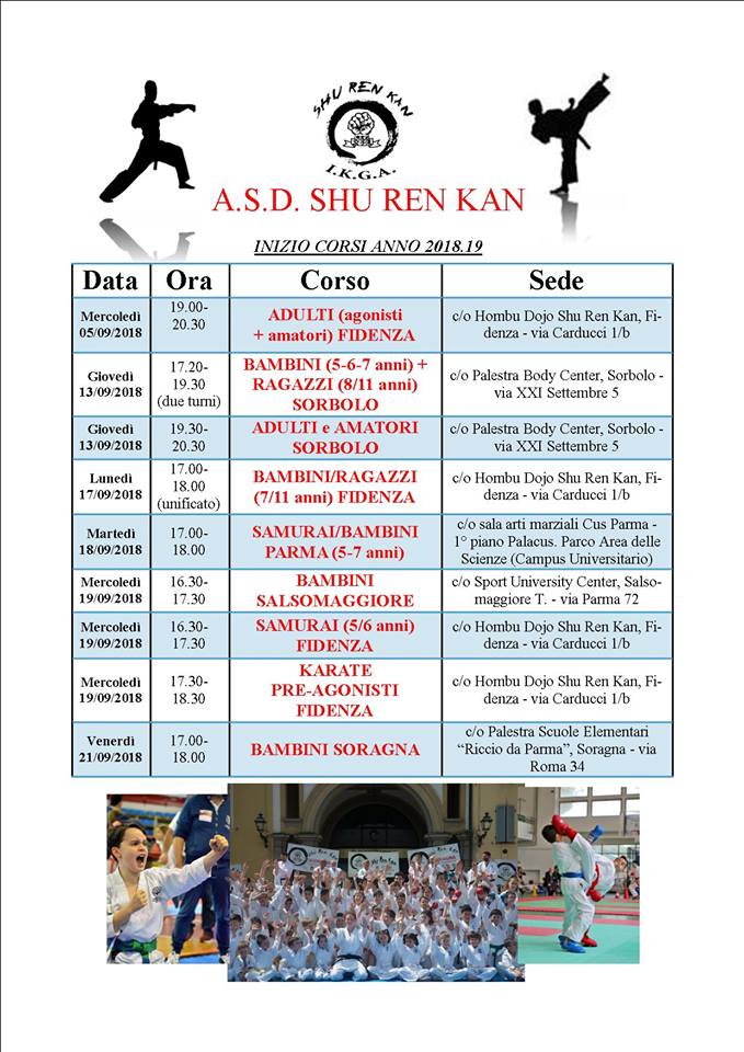 Shu Ren Kan è pronta a ricominciare la stagione! Nuove iniziative e novità saranno la base di studio e formazione anche per quest’anno. Sottostante troverete due schemi: DATE DI INIZIO CORSI e ORARI CORSI DELLA SETTIMANA. Ricordiamo che per maggiori informazioni potete visitare la pagina inerente ai corsi o venirci a trovare direttamente presso la sede. Vi aspettiamo! La prima prova è gratuita!