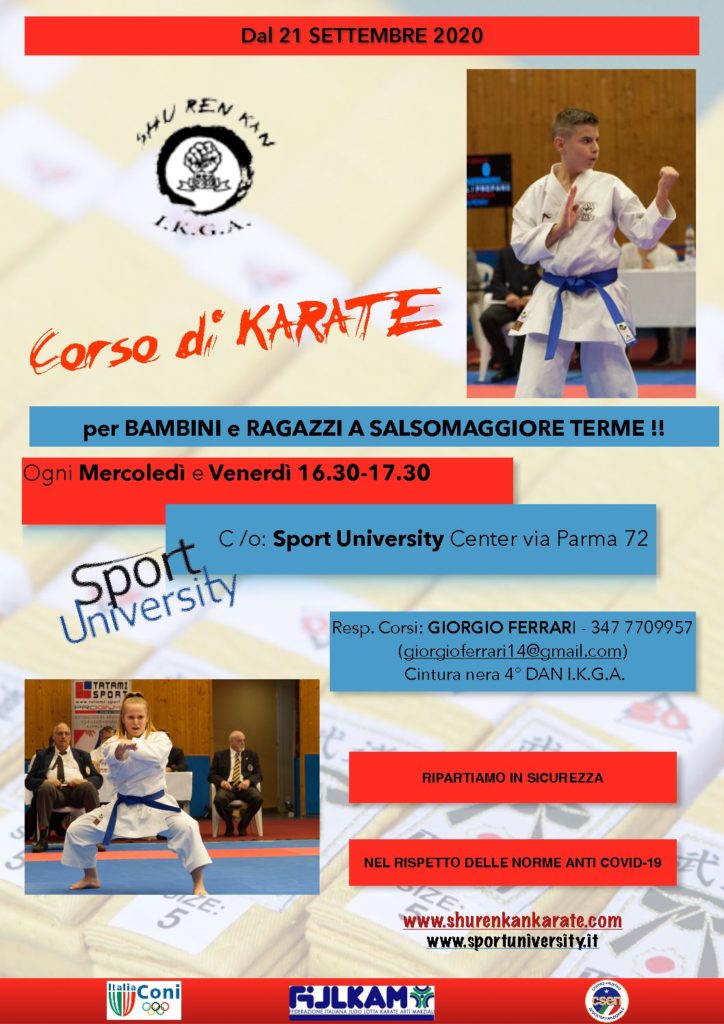Dal 23 settembre 2020 c/o il centro Sport University, ripartono in sicurezza tutti i corsi di Karate della scuola di Salsomaggiore Terme. Sottostante maggiori informazioni dei corsi: